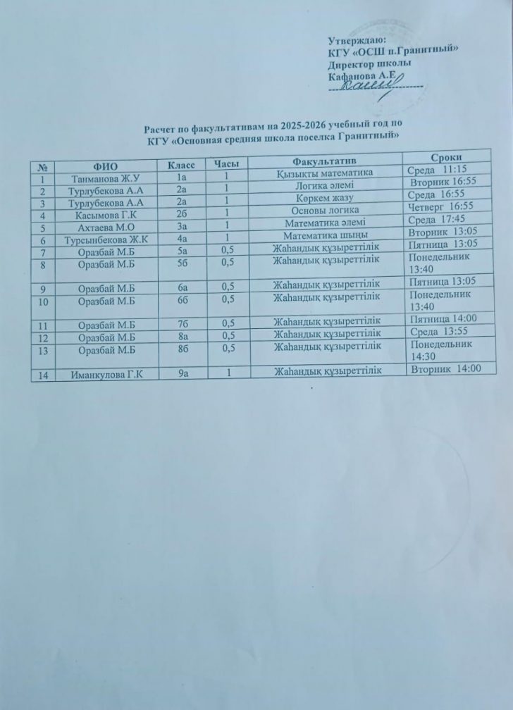 Вариативтік сабақтың кестесі 2025-2026 оқу жылы